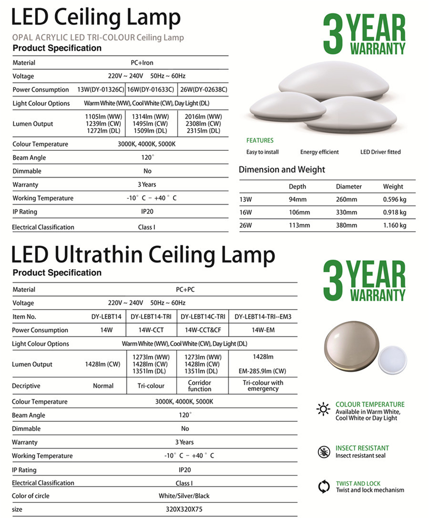 | DY-3014L | 14W | 3000-6000K | 1274lm | RA≥80 | IP54 | 252*252*92mm |